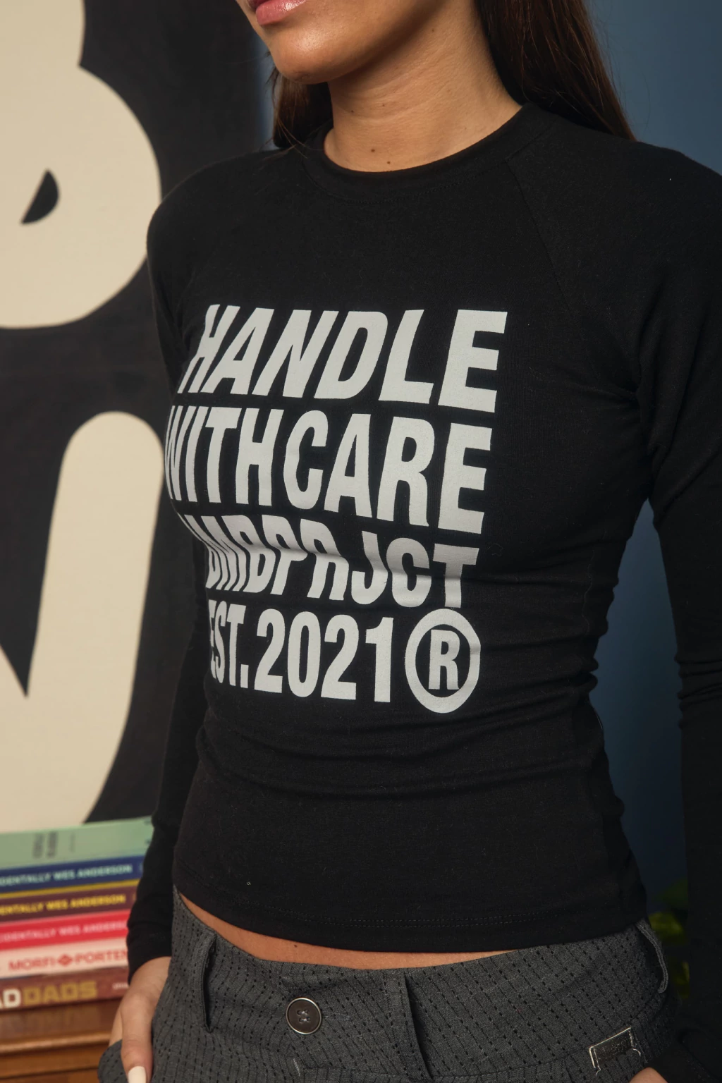 • Baby tee negra manga larga . Estampa en el frente.