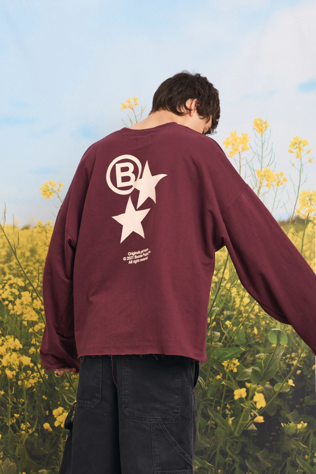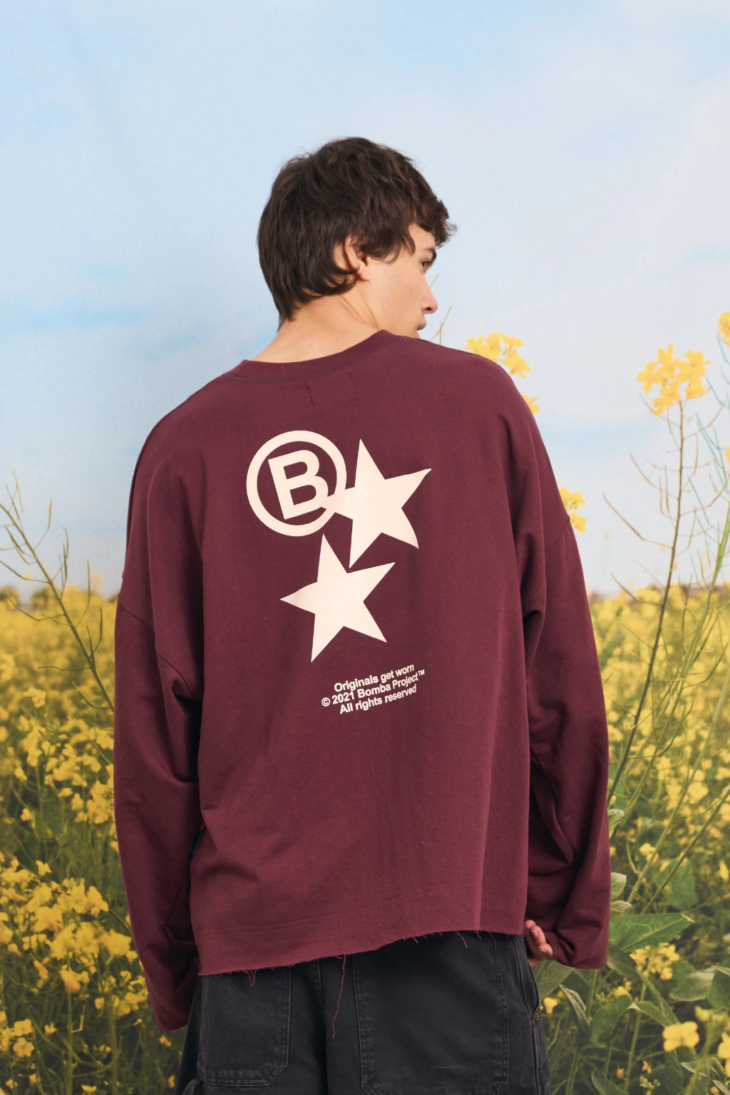 • Buzo cuello redondo de rústico bordó. Puños y cintura al corte. Estampa en frente y espalda.