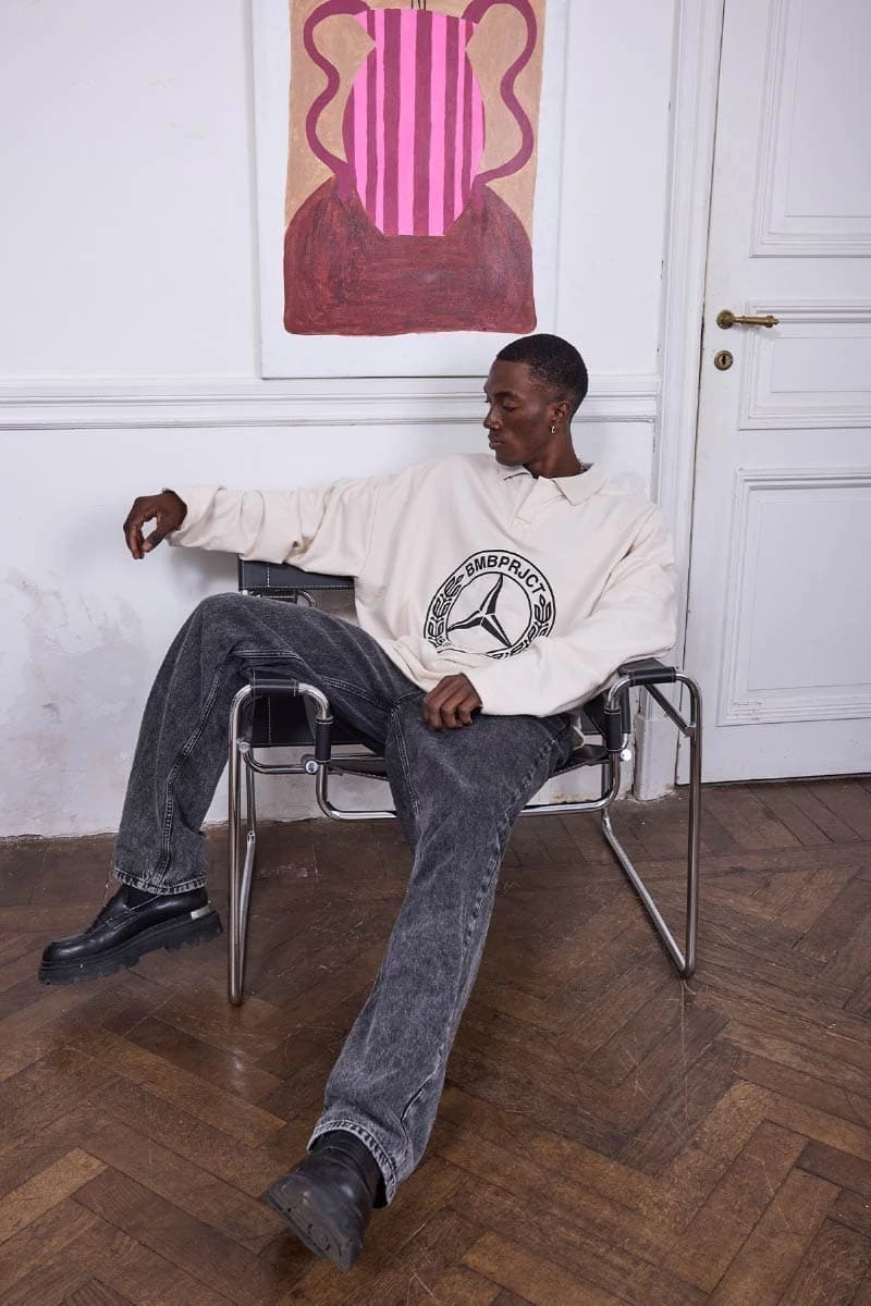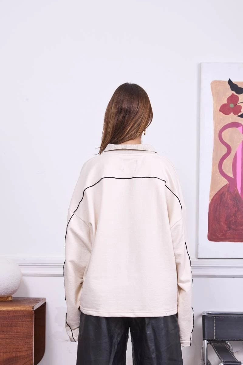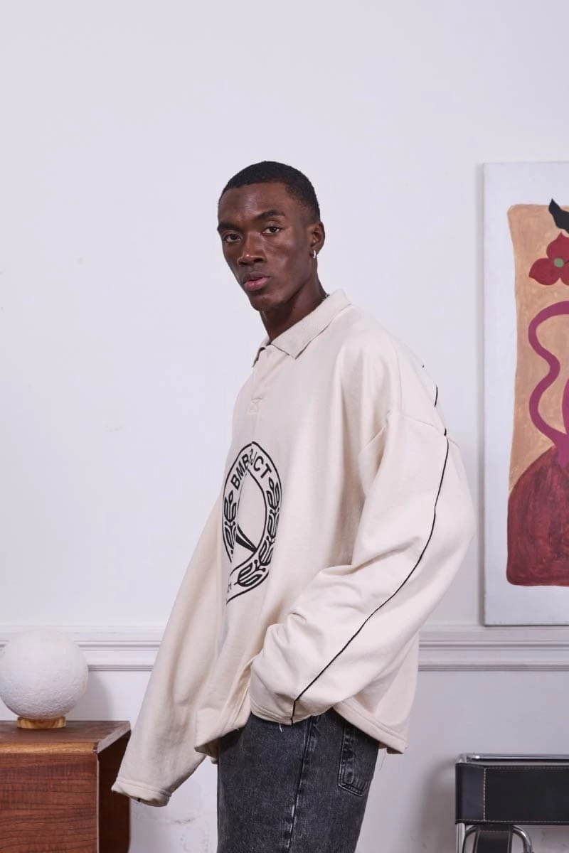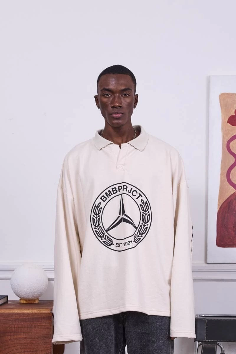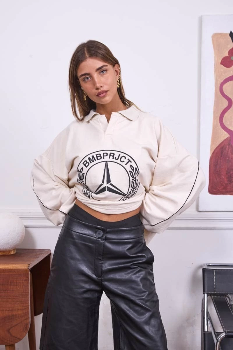 • Buzo polo crudo. Estampa en el frente. Vivos en espalda y mangas.