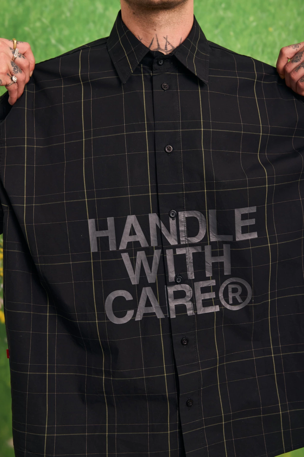 • Camisa manga corta a cuadros negra. Estampa en el frente. Detalle de etiquetas marcarias tejidas en el lateral.