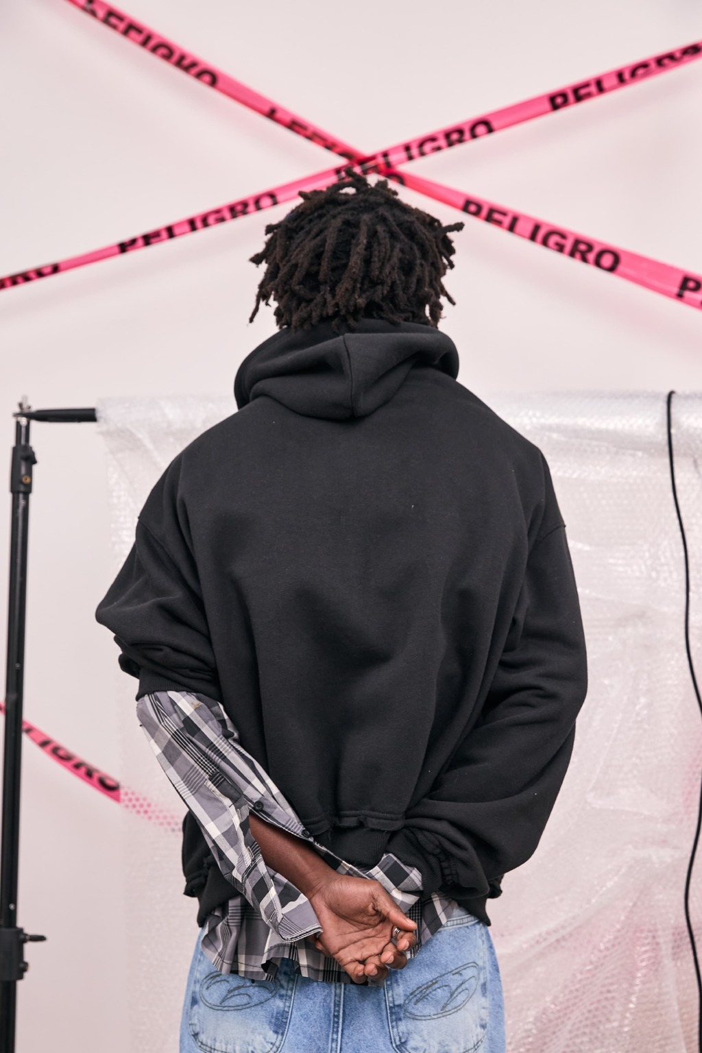 • Campera negra con capucha y cierre doble carril. Estampa en frente.