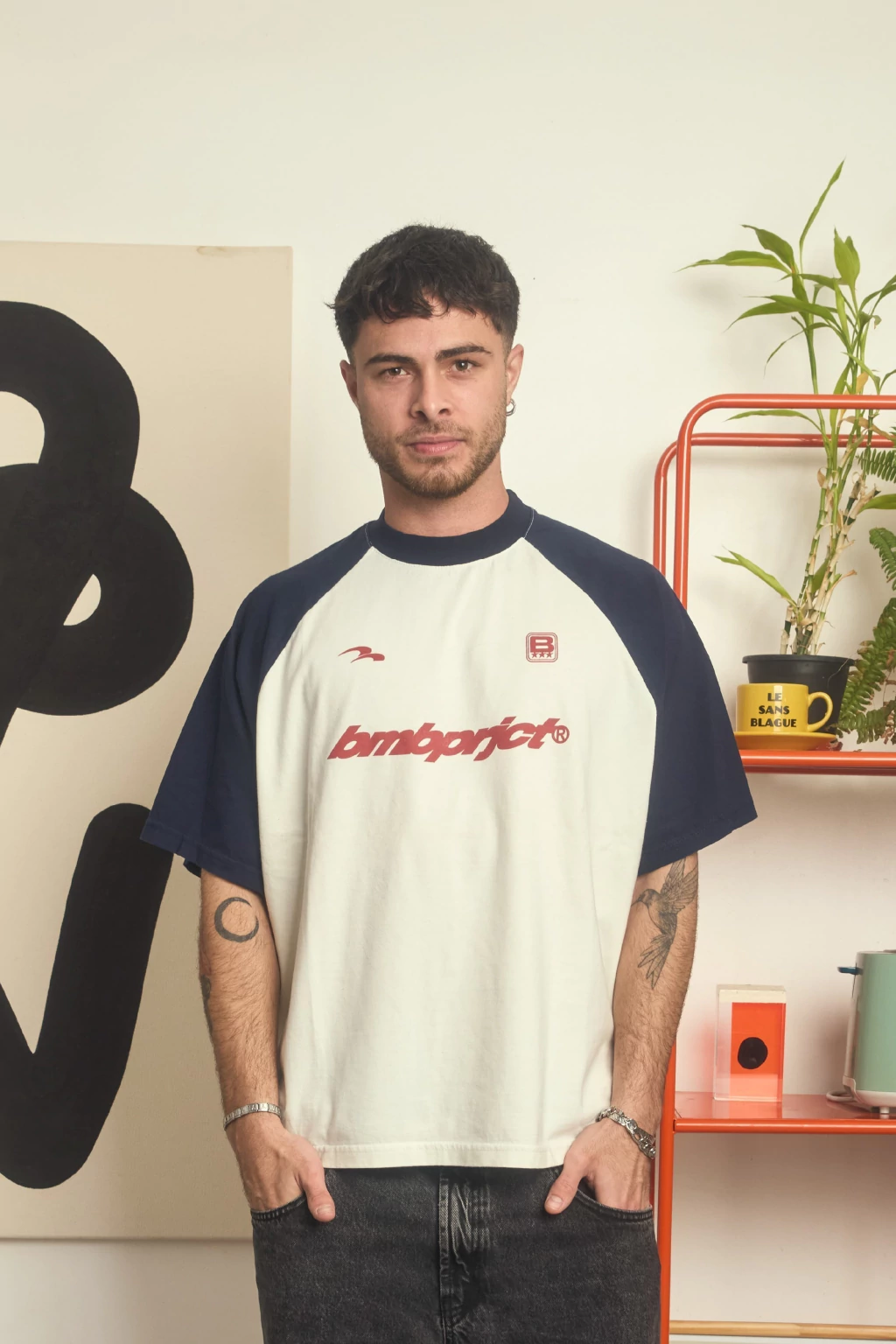 • Remera blanca con mangas raglan azul. Estampa en frente.