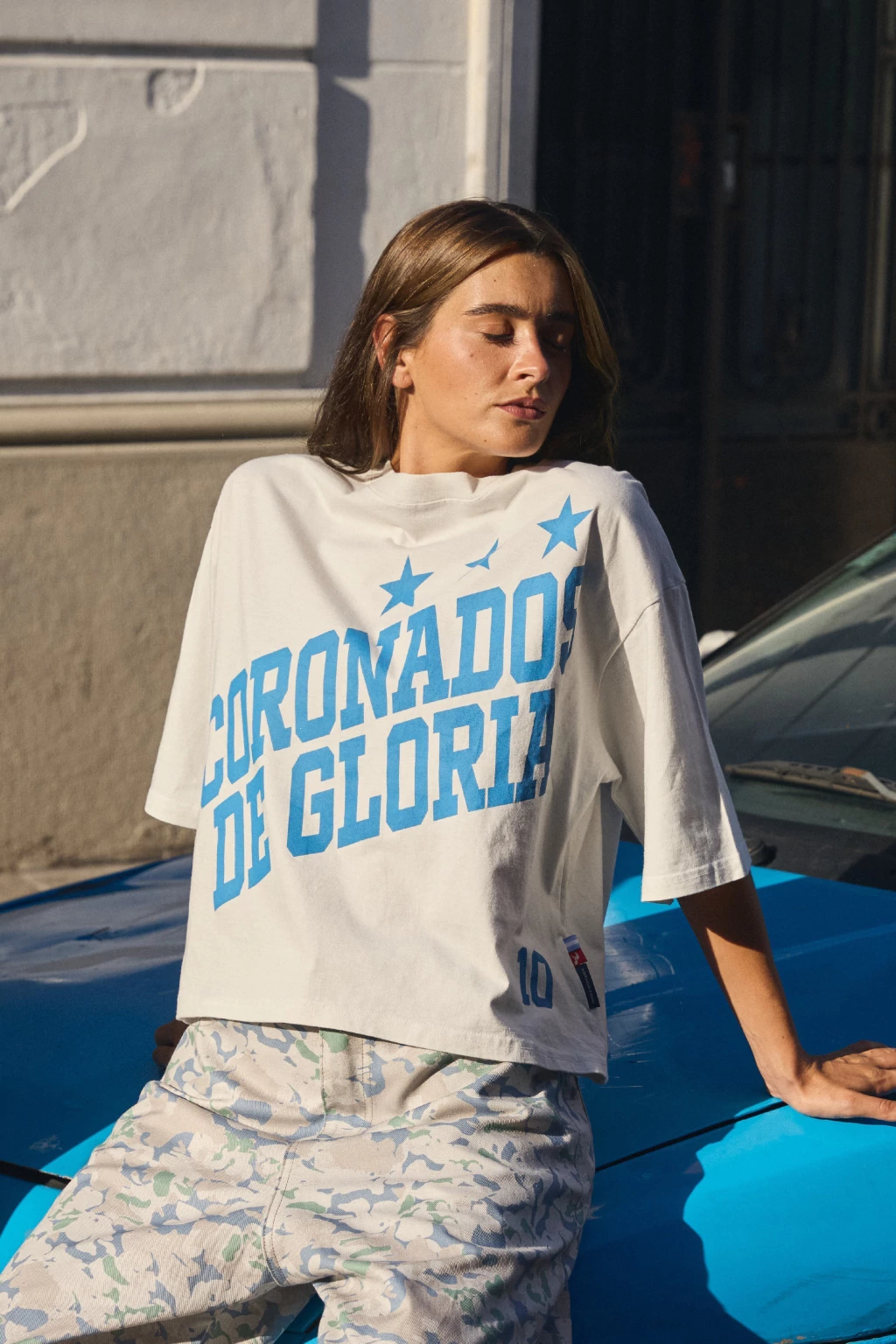• Remera blanca boxy fit. Estampa en frente y espalda.