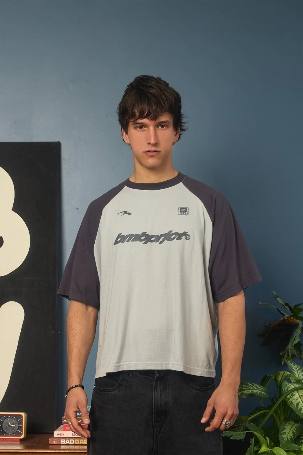 • Remera gris con mangas raglan gris oscuro. Estampa en frente.