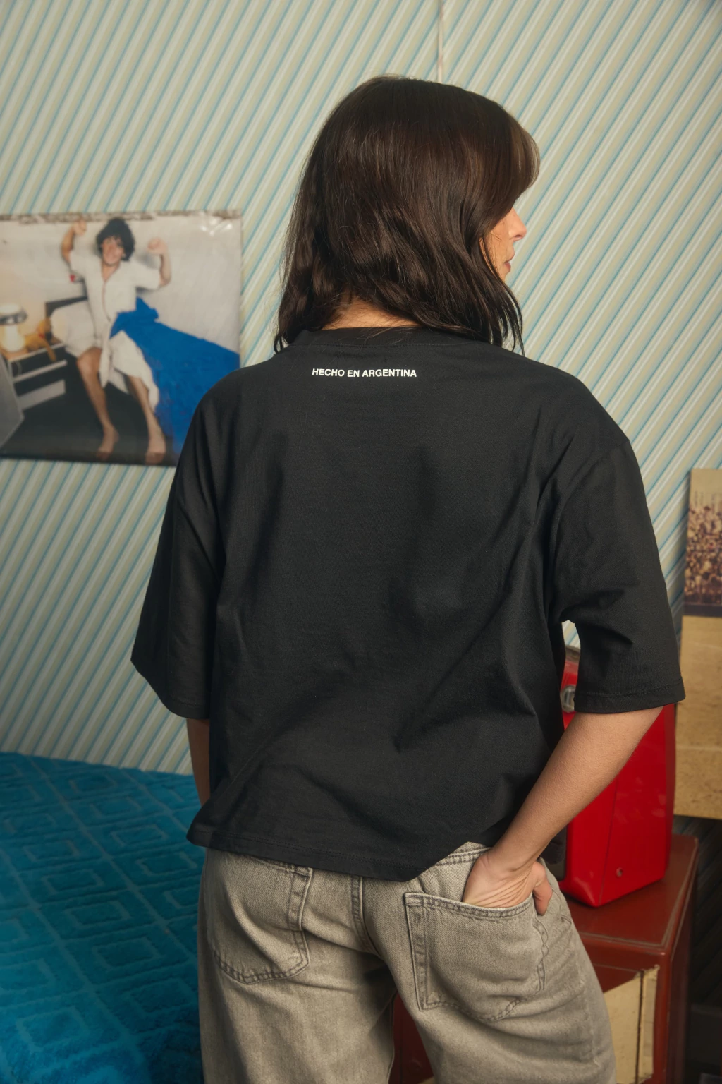 • Remera negra. Estampa en frente y espalda. Detalle de etiquetas marcarias tejidas en el lateral.