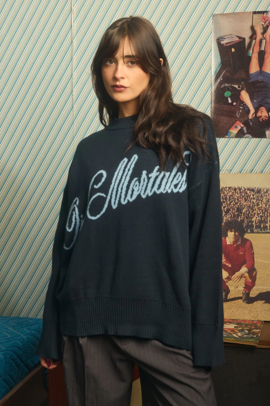 • Sweater boxy fit azul marino. Diseño estilo jacquard en el frente.
