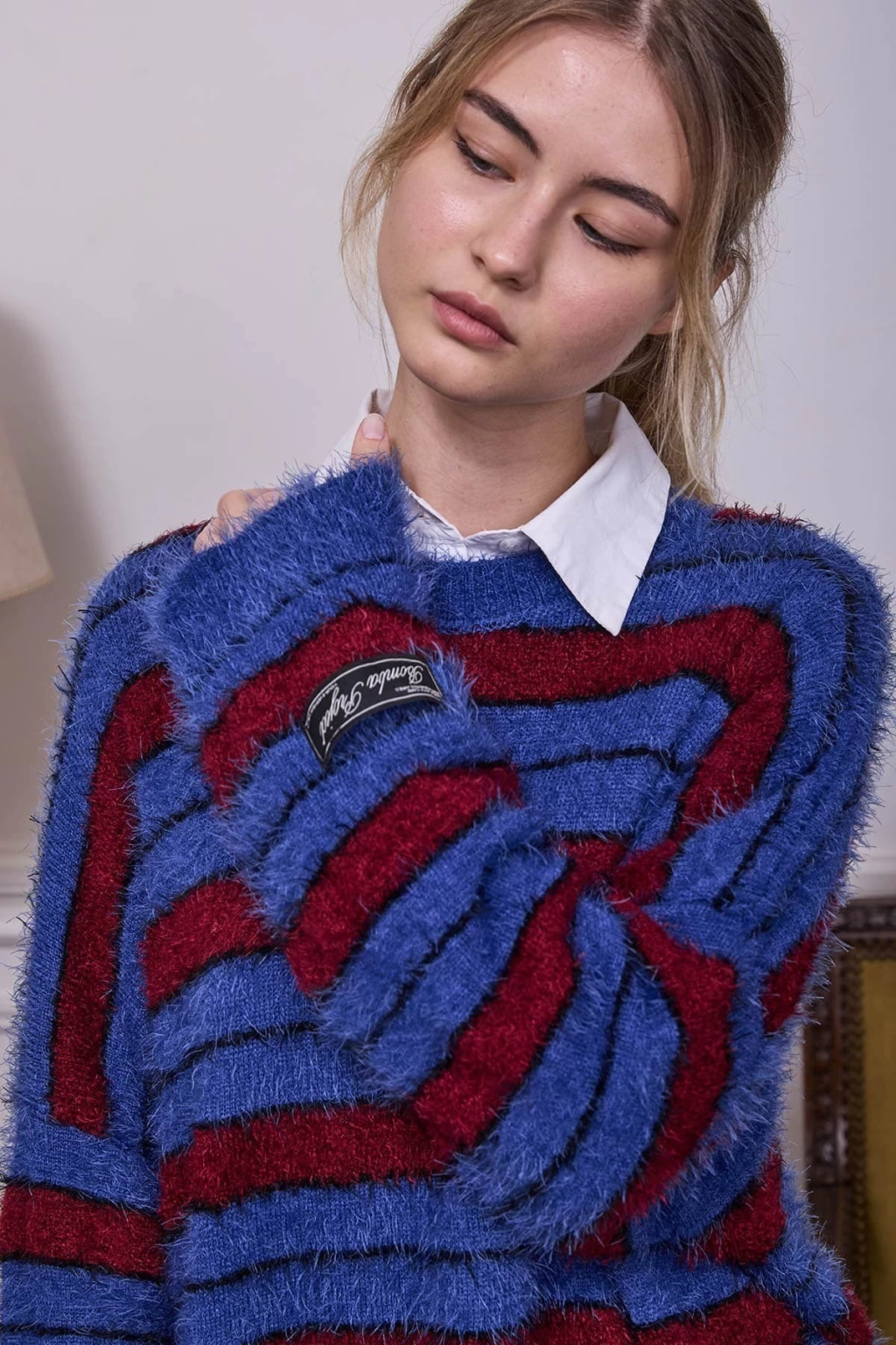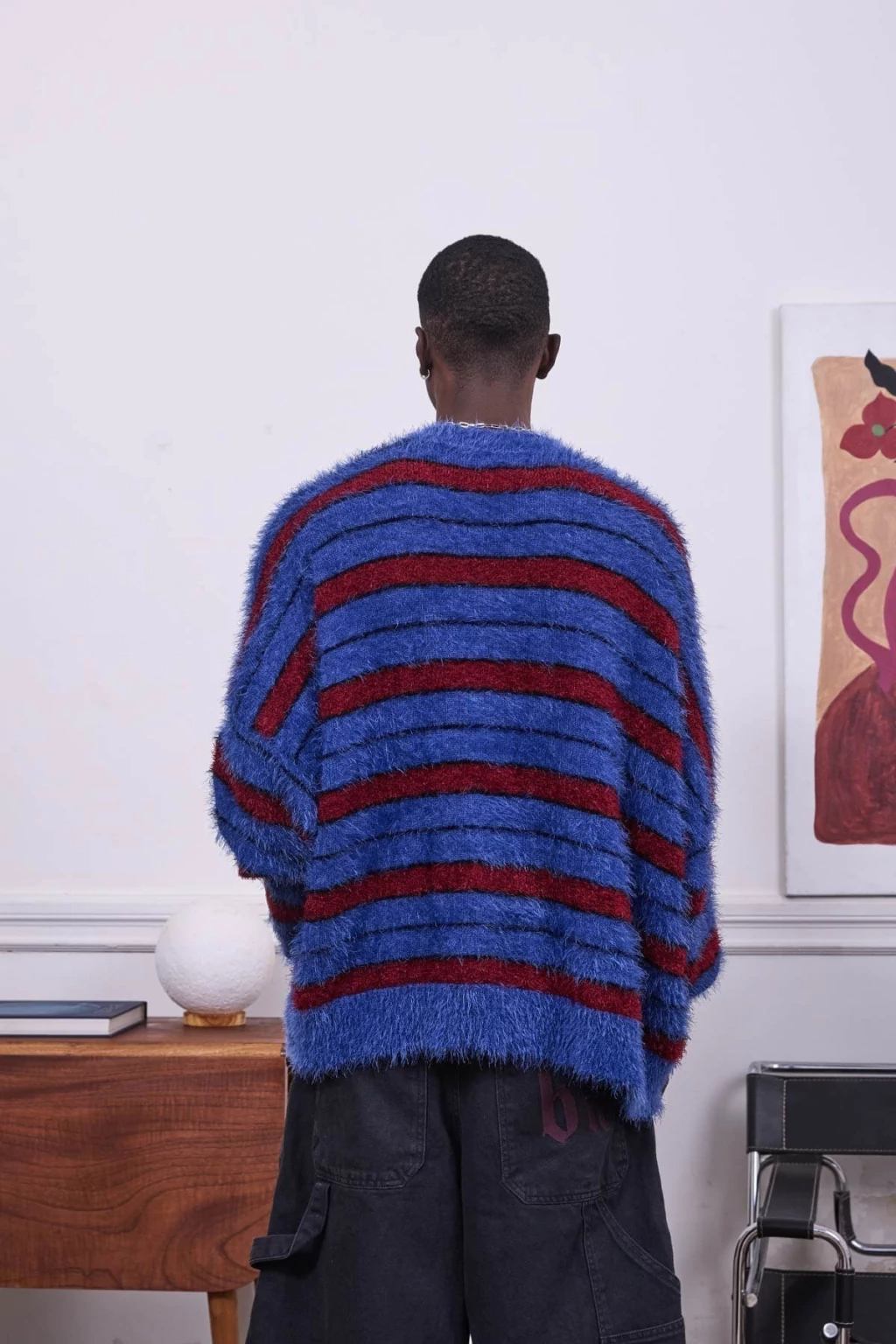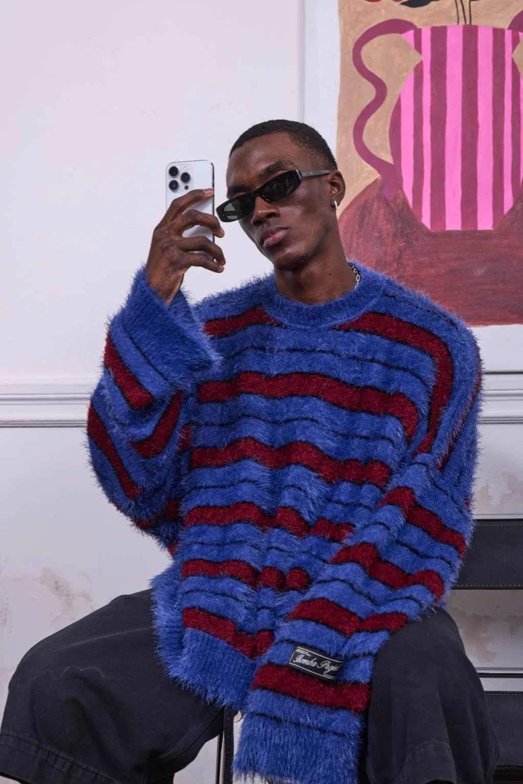 • Sweater boxy fit rayado azul y rojo. Etiqueta bordada en manga.